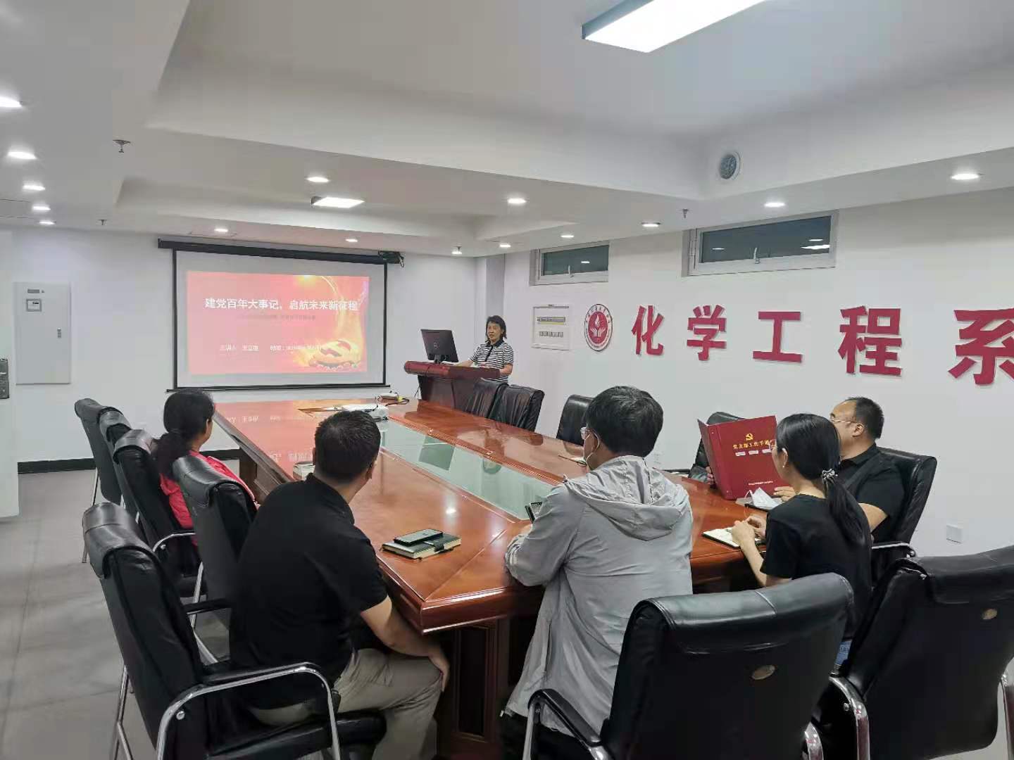 5月27日下午,化学与应用化学系党支部书记王立艳在逸夫楼412会议室给支部党员讲授“建党百年大事记,启航未来新征程”党史学习教育专题党课。